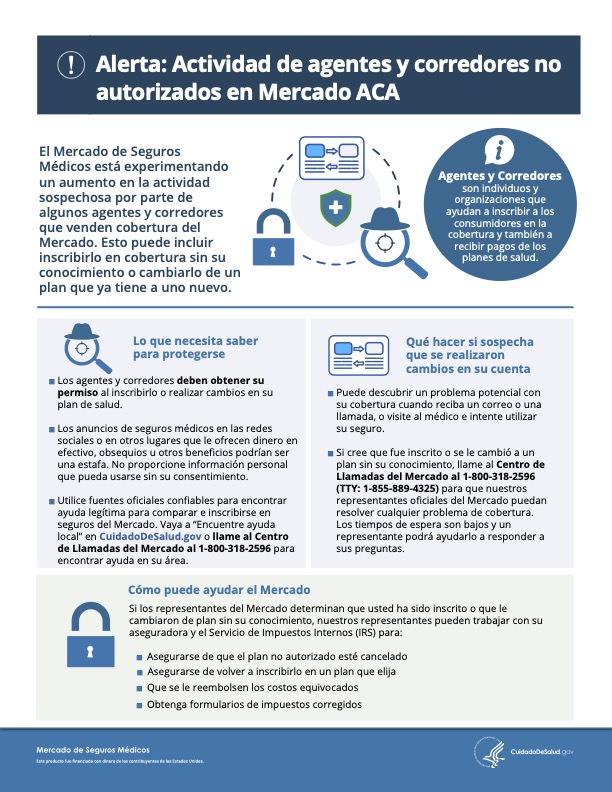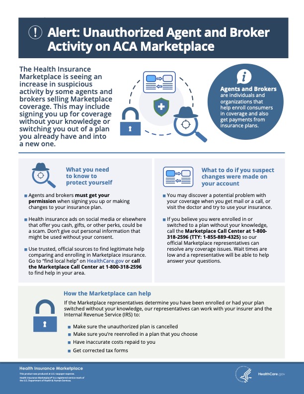 At Lifecare, protecting our members and their coverage is a top priority. This infographic from the Health Insurance Marketplace highlights a rise in unauthorized agent and broker activity that can lead to people being enrolled in or switched between ACA Marketplace plans without their knowledge. It outlines key warning signs to watch for, practical steps to safeguard your personal information, and what to do if you suspect changes were made to your coverage without your consent. The resource also explains how the Marketplace can help resolve issues, correct costs, and ensure you are enrolled in a plan you choose. If you have any questions or concerns about your coverage, the Lifecare team is here to help and encourage you to reach out.